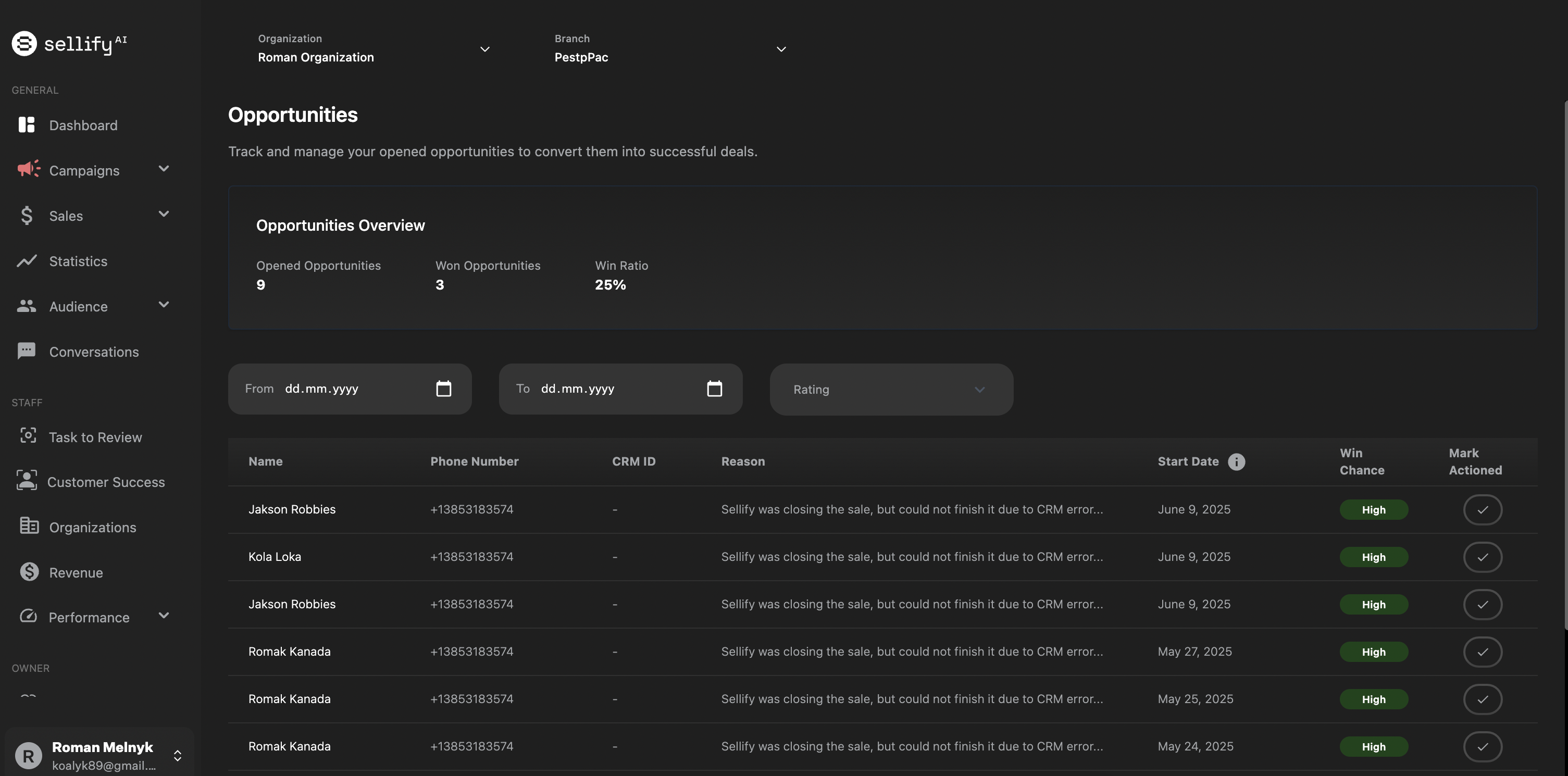 - Prevent Lost RevenueSellify AI tries its best to handle all sales end to end. But, at times,there might be limitations to what the software can do, stalls in customer communication (due to lack of response from the customer), or technical issues (maybe the conversation stalls or the AI isn’t able to close the sale). The Sales Opportunities Popup, and tab, ensures these near-misses don’t become permanently lost.